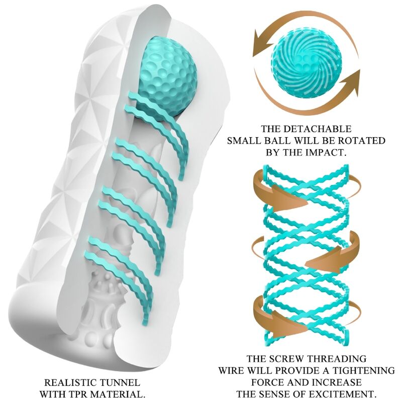 Petit outil pour un plaisir de masturbation gigantesque ! Ce masturbateur transparent et réutilisable possède une spirale rotative et une boule de stimulation sur le côté, la spirale rotative fait tourner le masturbateur lors de la pénétration et la boule sur le dessus peut stimuler le bon endroit et vous procurer une nouvelle sensation. La gaine possède à l'intérieur une texture stimulante et excitante qui masse le pénis de manière intense et dynamique lors du travail manuel. Vous pouvez utiliser cet élégant masturbateur doux pour la peau encore et encore. Très simple d'utilisation et un pur plaisir !
