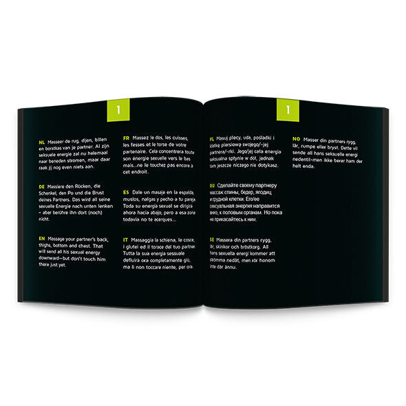 Les 24 défis de l'édition Foreplay sont disponibles en 10 langues : anglais, espagnol, français, allemand, néerlandais, polonais, russe, italien, suédois et norvégien, et vous amèneront sans aucun doute à un point culminant que vous n'avez jamais connu auparavant. Êtes-vous assez méchant pour franchir le pas ? Laissez-vous surprendre, enthousiasmer et attirer, et surtout prenez le temps de profiter les uns des autres. Amusez-vous!